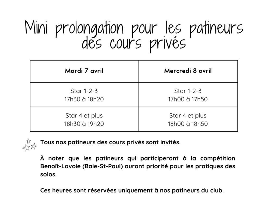Pour les patineurs des cours privés, une mini prolongation vous est proposée. Bien lire les informations sur l’infographie ci-dessous.